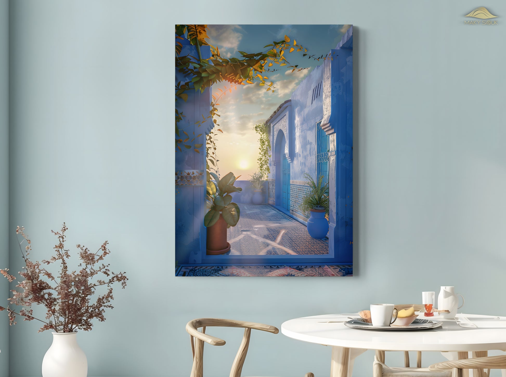 Tauchen Sie ein in die atemberaubende Welt der blauen Stadt Chefchaouen. Dieses Canvas-Motiv fängt die charakteristischen Blautöne und die einzigartige Atmosphäre Marokkos ein und bringt sie direkt in Ihr Zuhause. Der detailreiche Druck betont die Schönheit der traditionellen arabischen Baukunst und schafft ein visuelles Erlebnis, das Ihre Wände zum Leben erweckt.