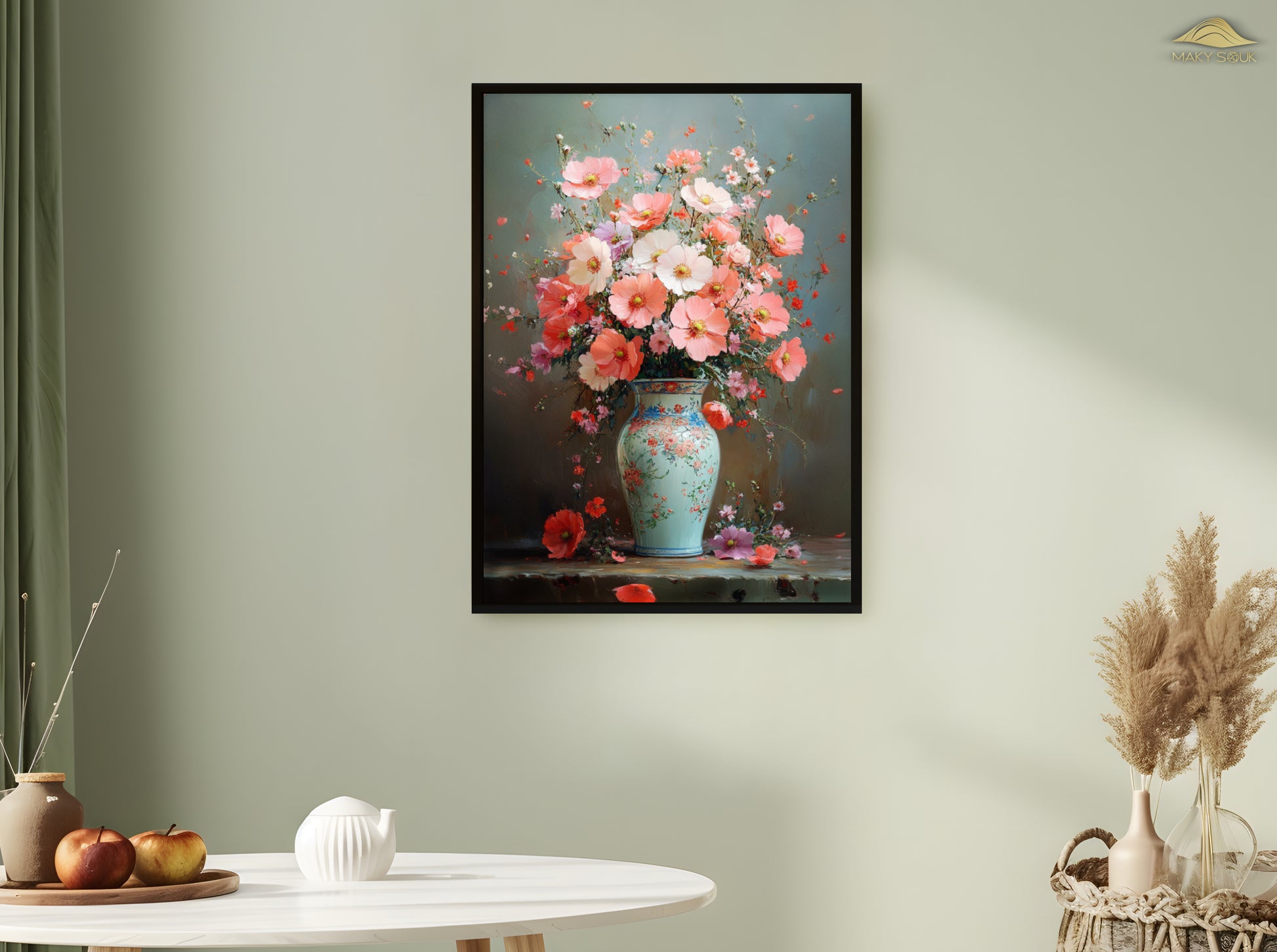 Verleihen Sie Ihrem Raum eine sanfte Note mit unserem Poster, das eine elegante Vase voller zarter Blumen zeigt. Die sanften Blüten und die anmutige Präsentation schaffen eine beruhigende und einladende Atmosphäre, die jedem Raum eine charmante und natürliche Eleganz verleiht. Dieses Kunstwerk bringt die zeitlose Schönheit der Natur direkt in Ihr Zuhause.
