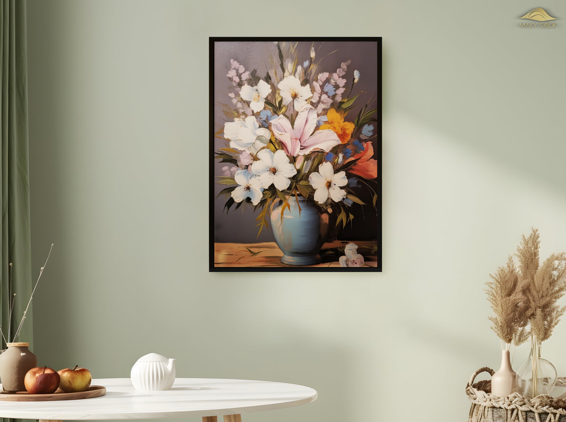 Verleihen Sie Ihrem Raum eine sanfte Note mit unserem Poster, das eine elegante Vase voller zarter Blumen zeigt. Die sanften Blüten und die anmutige Präsentation schaffen eine beruhigende und einladende Atmosphäre, die jedem Raum eine charmante und natürliche Eleganz verleiht. Dieses Kunstwerk bringt die zeitlose Schönheit der Natur direkt in Ihr Zuhause.